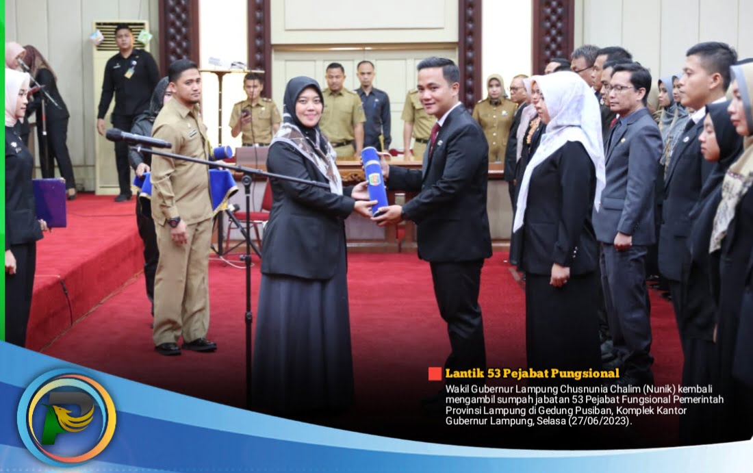 psiaceh.or.id/ – Wakil Gubernur Lampung Chusnunia Chalim (Nunik) kembali mengambil sumpah jabatan 53 Pejabat Fungsional Pemerintah Provinsi Lampung di Gedung Pusiban, Komplek Kantor Gubernur Lampung, Selasa (27/06/2023).